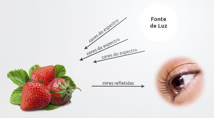A cor refletida é a cor que enxergamos e que não foi absorvida pelo objeto, então, se um objeto reflete a cor vermelha, como no exemplo acima, o veremos vermelho, se o objeto refletir o azul, você o verá azul e assim por diante.